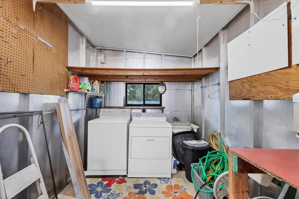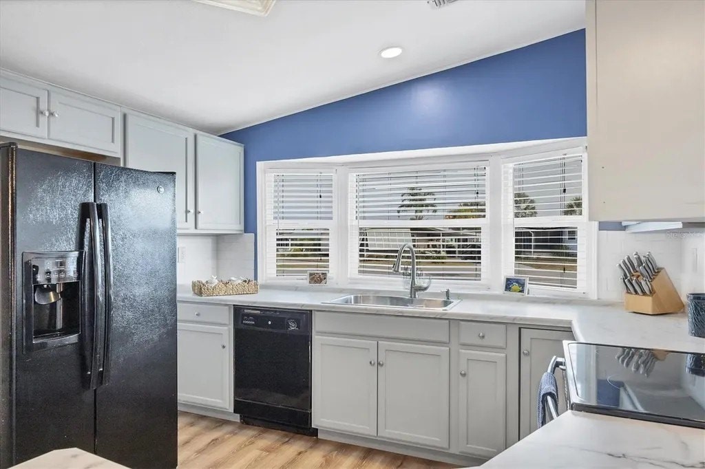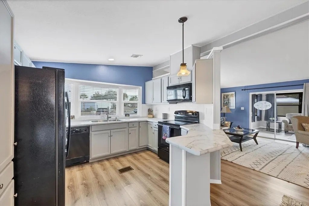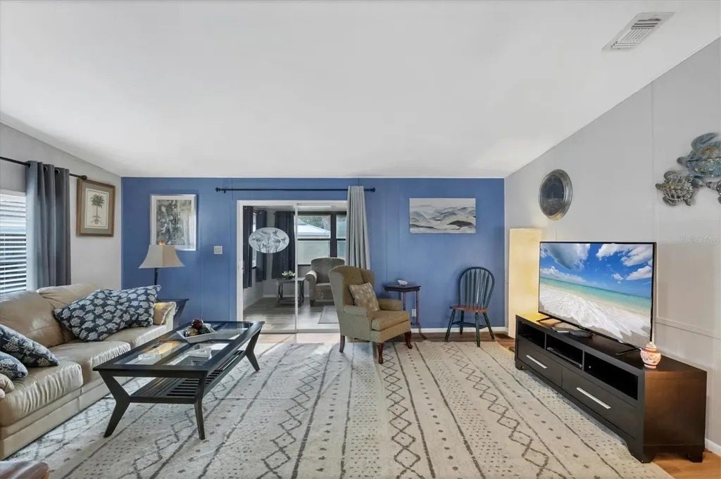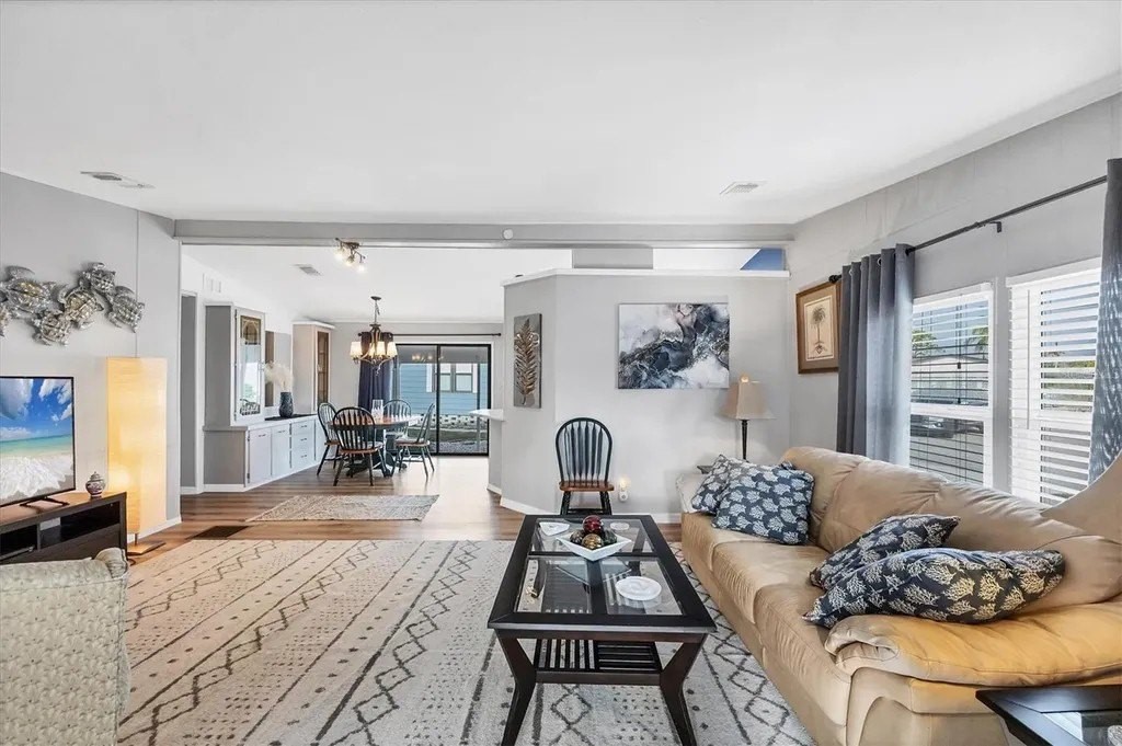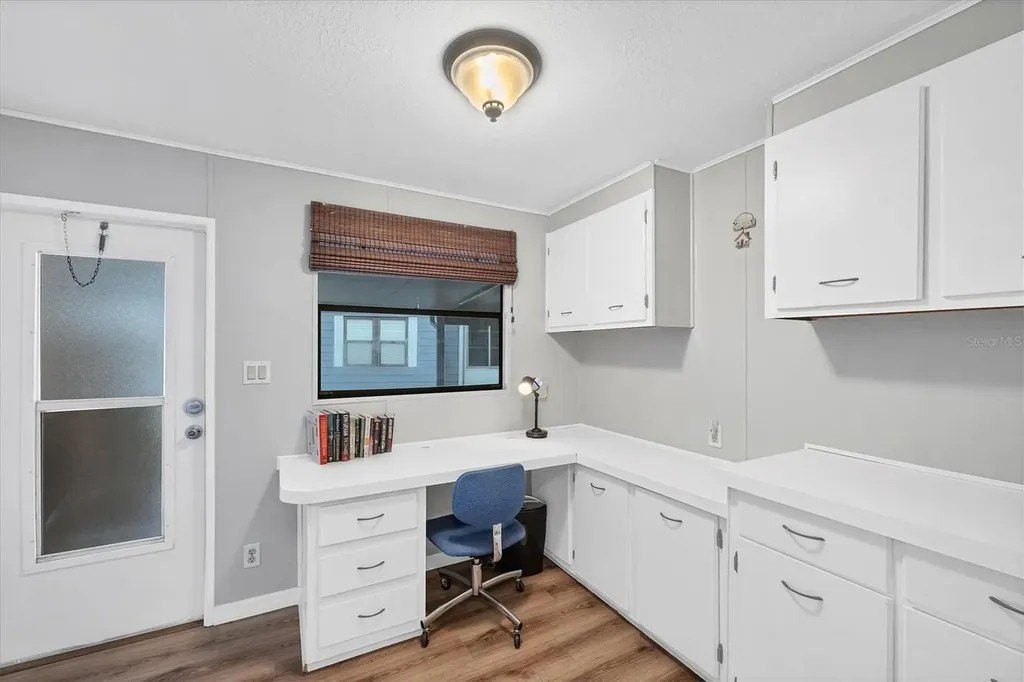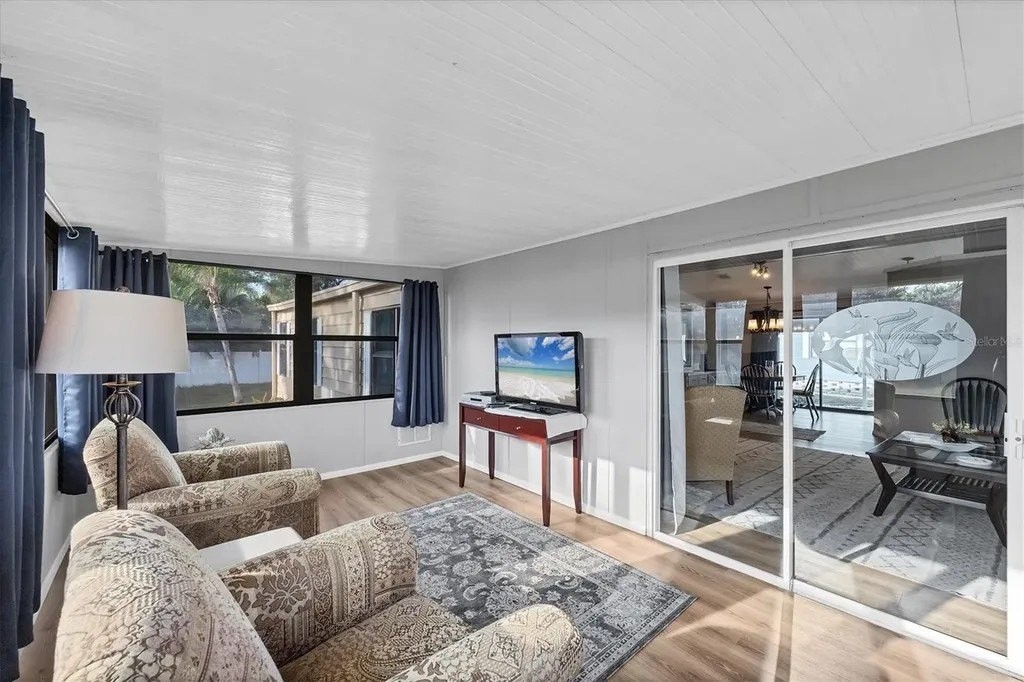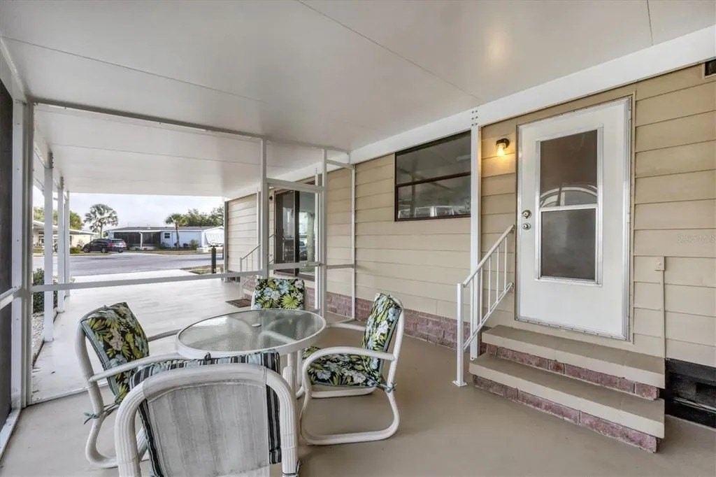 A very well-maintained home, on a quiet cul-de-sac and located in an X Flood Zone! This highly sought-after gated community of Tangerine Woods, is an active and friendly, 55 and over community, where you own the land your home is located on. For your leisurely pleasure, this community provides you with a large heated pool and clubhouse, an exercise room and library, tennis and pickleball courts, walking trails, shuffleboard, and so much more! This light and bright, color coordinated, turnkey furnished and beautifully maintained home, has renovations galore. A neat and clean home with a brand-new roof and A/C in 2023, new carport, new screened patio, new Laminate Plank flooring, new curtains, and new interior and exterior paint. The kitchen offers newer cabinets and marble look countertops, a pantry and a breakfast bar. The living room is stylishly furnished and decorated; the dinette includes a built-in cabinet, and the air-conditioned Florida room is just perfect for additional entertaining space. A spacious master bedroom, complete with 2 closets, is sure to provide all the comforts a master bedroom should, including an en suite bathroom, 2 sinks, a vanity, and a double door step in shower. The tastefully decorated guest bedroom has a walk-in closet, Berber carpet, and 2 twin beds to form a king size bed, as pictured. The bonus room can serve as an office, hobby room or additional storage space, is complete with counter/desk space, cupboards, and an exit to the outdoor lanai. The screened lanai off the carport is just perfect for enjoying our wonderful Florida weather. The shed, with its washer and dryer, has room for a work bench. There is also a small additional patio overlooking the private yard. The low monthly HOA payment of $226 includes cable TV, internet and grass cutting, and Tangerine Woods is pet friendly! This community is close to Historic Dearborn St., which provides casual dining, evening entertainment, locally owned shops and a Farmers Market on Thursdays. The local beaches are just 4 miles away, as well as many local golf courses, and world class fishing! Make your appointment today to see this meticulously cared for home, as it won't last long!